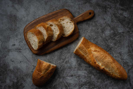 Sliced french baguette with crumbs on dark background, French homemade baguette bread. Wheat baguette on black shale, fresh tasty bread or baguette