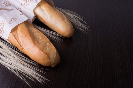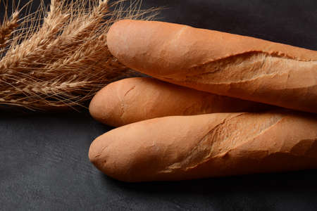 French fresh bread baguettes on a dark background and wheat