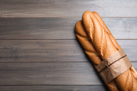 Traditional French baguette wrapped in brown paper over wooden background. Sustainable package zero waste concept. Flat lay. Top View