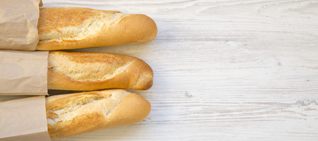 French baguettes in paper bags on white wooden table, top view. Copy space.