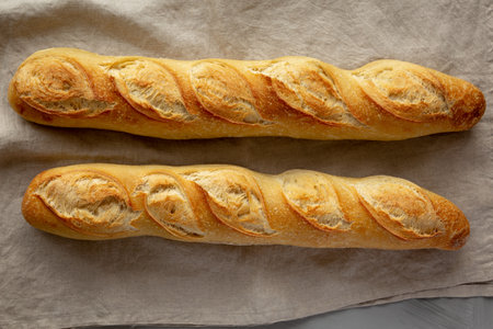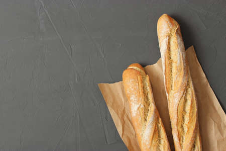Homemade French Bread Baguette on a gray background, top view.