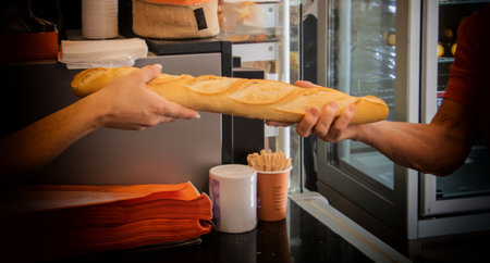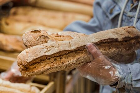 Close up of man hand holding french baguette in bakery shop