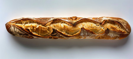 A freshly baked baguette with a crispy crust sits on a white background, ready to be sliced and enjoyed.