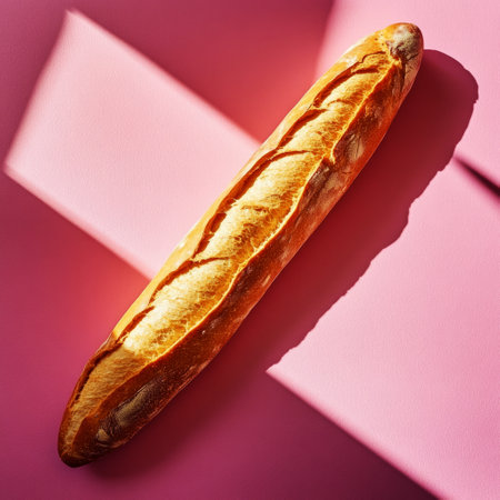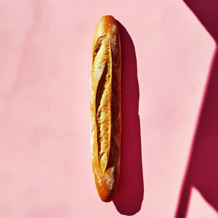 A crispy, golden baguette leaning against a soft pink wall, casting a strong shadow that emphasizes its texture, set in a casual yet inviting food photography style