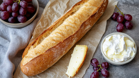 A fresh French baguette with a side of creamy camembert cheese and grapes.