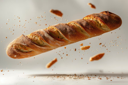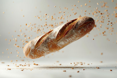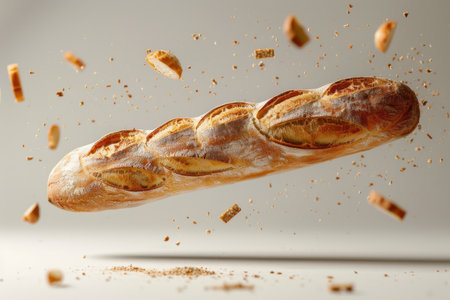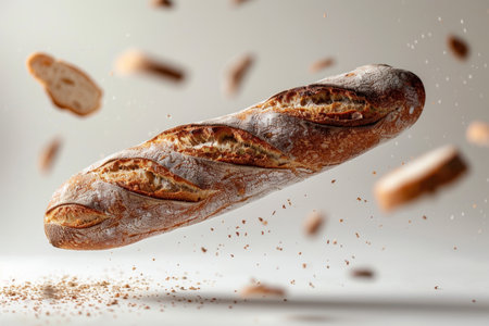 Levitating French Baguette Country Bread Studio Shot Cream Gray Background Minimalist