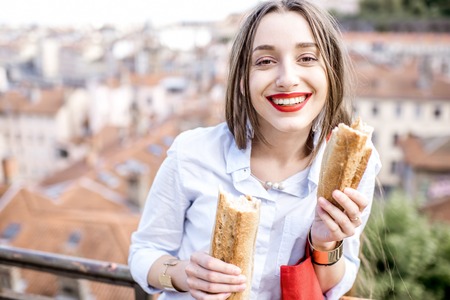 Woman with baguette in Lyon