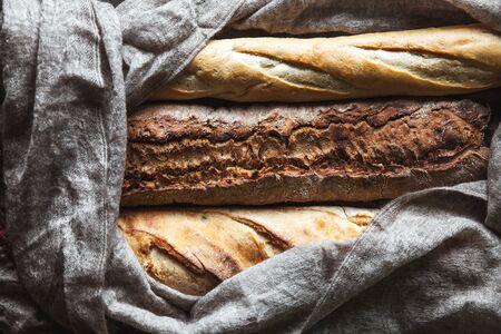 Top view of various kinds of bread on a wooden surface. Close up Concept of homemade bread, small bakery, natural farm products, local food, domestic production. Healthy and tasty organic food.