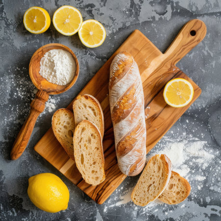 A beautifully arranged still-life featuring freshly baked bread alongside lemons and flour on a rustic wooden board. Perfect for culinary inspiration.