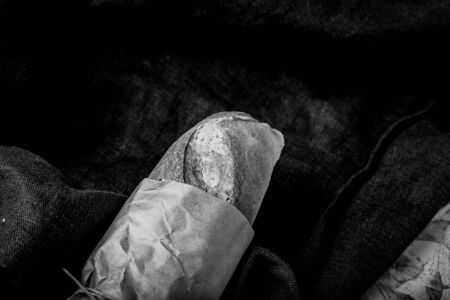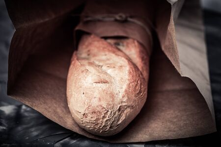Baguette bread, french stick, wrapped in brown paper tied with string. Recycle packaging concept