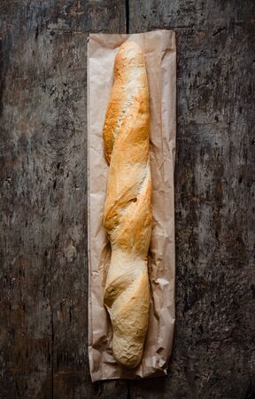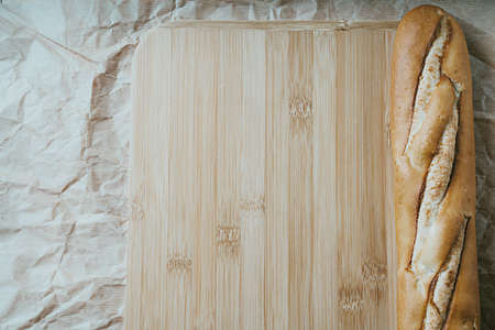 Delicious french baguette close-up, on baking paper, background with copy space. Concept of development of craft bakeries