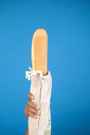 Fresh bread and baguette in cotton bag. Bakery Products. Friendl