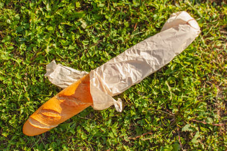 Baguette in paper packaging lie on the grass. Top view
