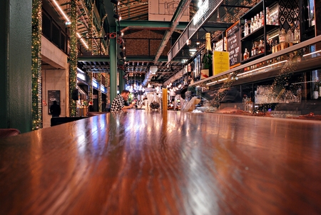 Warsaw, Poland. 31 January 2017.Empty of wood counter bar The 'Koszyki' market hall,