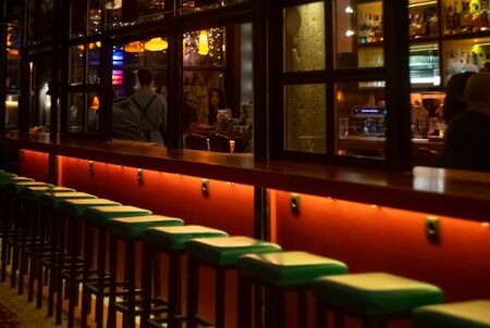 Athens / Greece, Night scene from a bar downtown. Vintage decoration green stools and atmospheric illumination. Selective focus on bar stools.