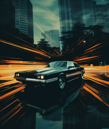 Vintage sports car driving on city streets, chrome bumper shining generated by artificial intelligence
