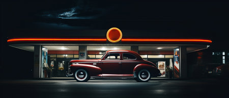A vibrant red classic car parked outside a neon-lit diner at night. The glowing lights create a nostalgic atmosphere, showcasing vintage aesthetics and urban charm.