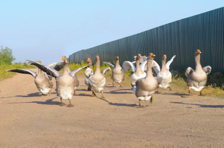 Domestic gray geese on a meadow. Gray Geese in the grass, domestic bird, flock of geese