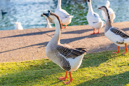 Geese walking on the beach close to the pond in city park