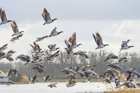 Flock of geese flying in the sky or a natural park in winter