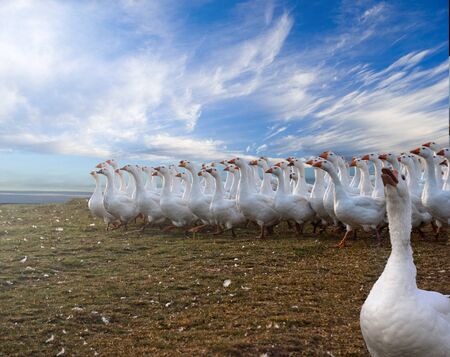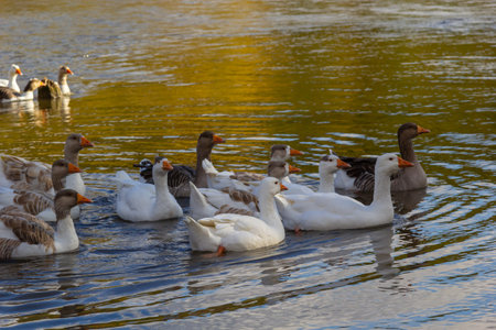 Domestic geese swim in the water. A flock of white beautiful geese in the river.