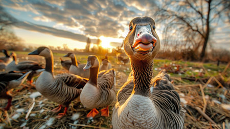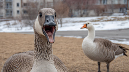 Fierce Angry goose closeup. Humorous group domestical animals with feathers. Generate AI