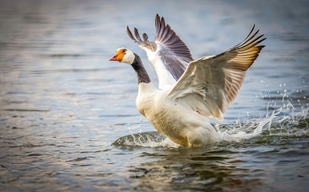 A beautiful goose spreads its wings gracefully in the early morning mist, creating a serene and tranquil scene. This captivating image captures the essence of wildlife in nature.