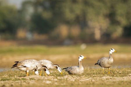 bar- headed or bar headed goose family or flock in an open field or grassland during winter migration at forest of cental india - anser indicus