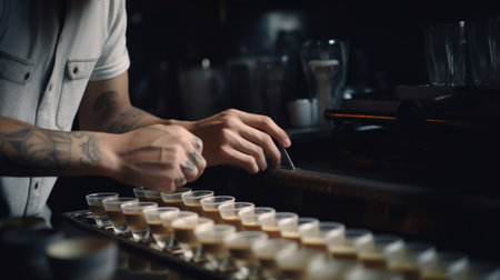 Brewers at work, behind the bar, pouring craft drinks, rustic setting, natural lighting, close-up shot, detailed and inviting scene