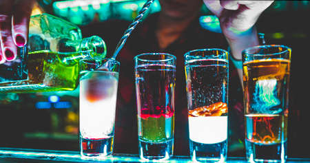 bartender making collection of colorful shots. Set of cocktails at the bar