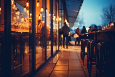 An outside evening bar with defocused backdrop featuring dazzling light showcases, well-lit bar counter, tables, and high chairs, setting the scene enjoyable night out.