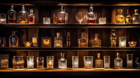 A stylish bar shelf showcasing an array of bottles and glassware, illuminated by warm lighting. Perfect for any modern hospitality space or nightlife setting.