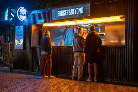 LONDON - SEPTEMBER 14, 2021: Customers buying food at burger stall on London's Southbank at night