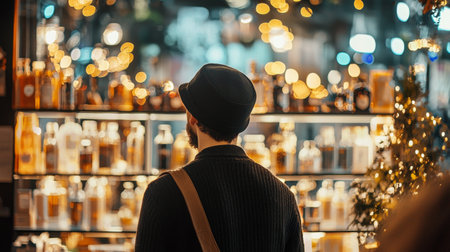 A stylish man wearing a hat stands in front of a brightly illuminated storefront with golden bokeh lights, creating a festive ambiance.