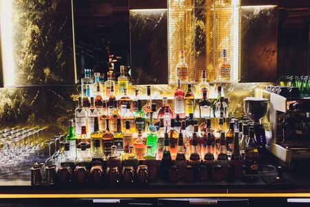 Ufa, Russia, 1 July, 2019: Several types of bottled alcohol are displayed on some shelves in a pub.