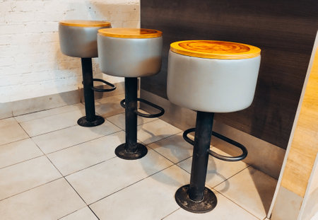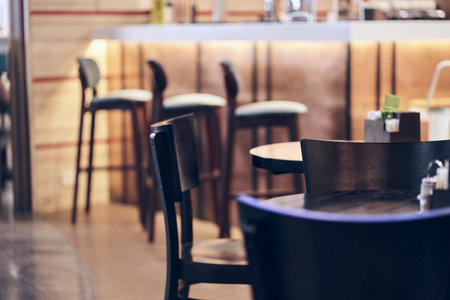 Row of black metal stools next to a wood table in a restaurant. Copy space.