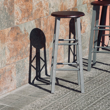 This image features wooden bar stools arranged neatly against a wall, enhanced by beautiful shadows and warm sunlight, creating a serene cafe atmosphere.