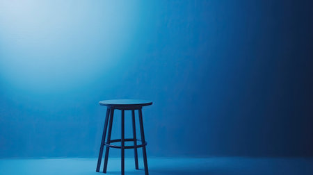 Minimalist setup with a smooth blue wall, table, and subtle spotlight reflections, perfect for showcasing branding products.