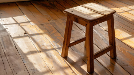 A rustic wooden stool stands alone on a sunlit wooden floor, casting beautiful shadows that enhance the warm atmosphere of the cozy indoor space.