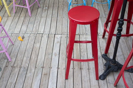 red high bar chair, red metal stool on wooden floor in restaurant