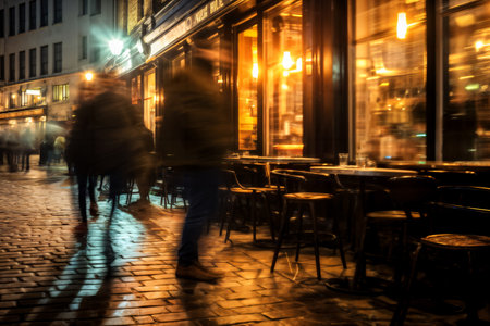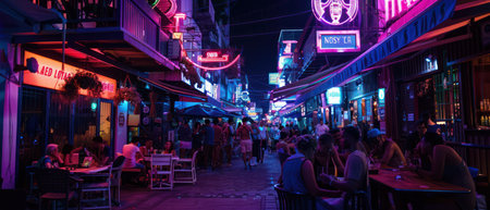 Bokeh background of street bar beer restaurant, outdoor in asia, people sit chill out and hang out dinner and listen to music together in avenue, happy life, work hard play hard. Generative AI