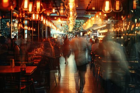 crowded restaurant or pub with people dining and waiters, bartender and chefs working, crowd drinking and eat in full bar or cafe, blurred motion. High quality photo