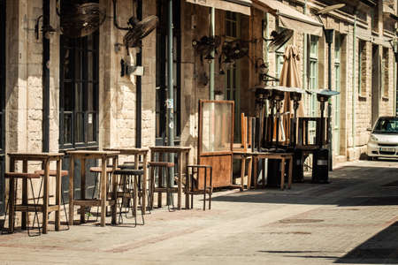 Limassol Cyprus April 16, 2020 View of various chairs and tables from restaurants closed to the public by the government during the quarantine of the population to prevent the spread of coronavirus