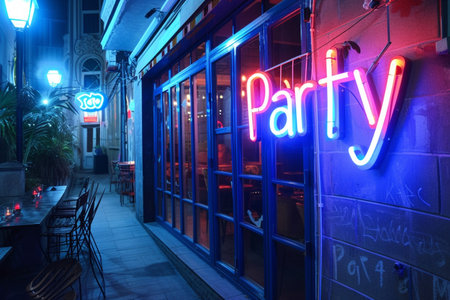 Madrid, Spain. 1 October 2023. A sign with a red bar sign with a lighting on a city street. A drinking establishment. Architecture in a dark key.