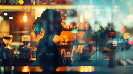 A woman sits at a table near a window, holding a cup of coffee. The interior is softly lit, contrasting with the vibrant street scene outside. Rain glistens on the pavement, reflecting neon lights and creating a moody atmosphere. This image could be used for various commercial or editorial purposes.