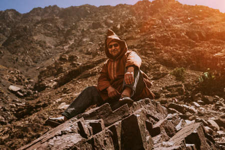 Portrait of a handsome Indian man with a beard and turban in the desert