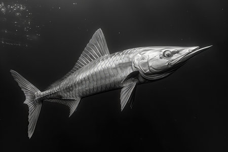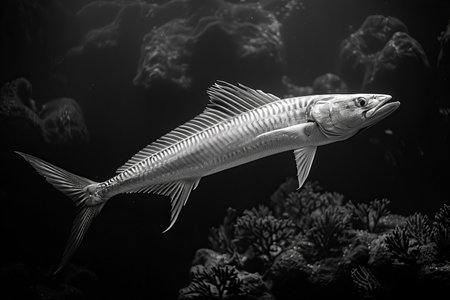 Barracuda fish swimming in aquarium. Black and white.