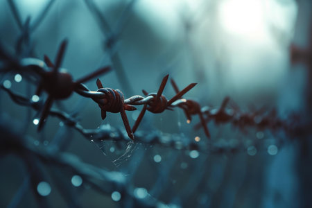 Intricate details of barbed wires surface, highlighting its sharpness and metallic sheen with a dreamy blurred background.