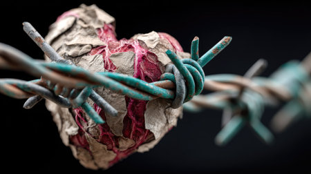 This striking image features a heart made of paper, ensnared in rusty barbed wire, representing the complex interplay of love, pain, and resilience.