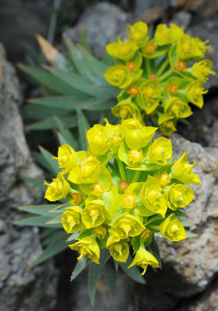 Green flowers of Euphorbia myrsinites, the myrtle spurge, blue spurge or broad-leaved glaucous-spurge. Flowering succulent species close up